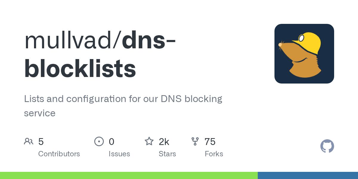 GitHub - mullvad/dns-blocklists: Lists and configuration for our DNS blocking serviceLists and configuration for our DNS blocking service - mullvad/dns-blocklists